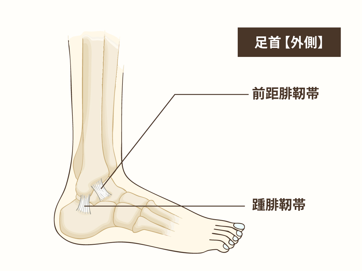 足関節の外側にある靱帯(前距腓靱帯や踵腓靱帯など)が、急な内返し(足裏が内側に向く動き)により伸ばされたり部分断裂・断裂することで生じる外傷です。最も多いのは前距腓靱帯損傷です。