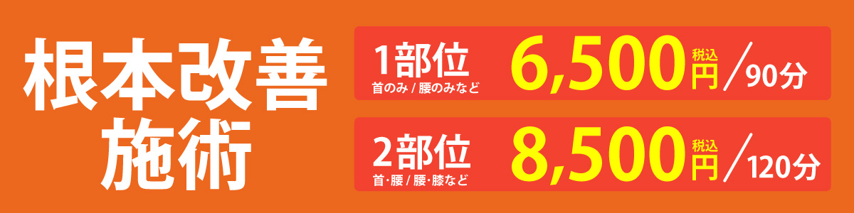 1部位(首のみ・腰のみ)/2部位(首や腰・腰や膝)などの部位数に応じて施術を行っております。健康保険とは異なり、自由診療となりますのでご要望の内容に合わせて施術を行うことが可能です。